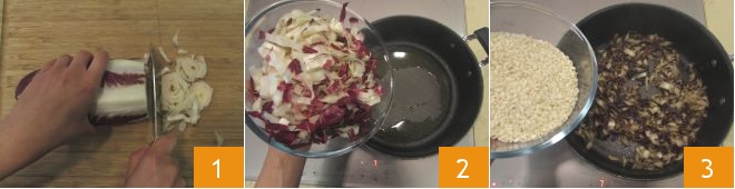 To prepare radicchio and gorgonzola supplì, first remove the base of the radicchio, wash it, and cut it into thin rings 1. Heat a drizzle of oil in a saucepan, add the radicchio 2, and let it wilt over medium heat for a few minutes, then add the rice 3 and toast it for about 2 minutes.