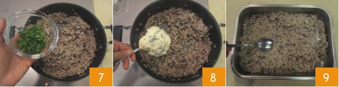 At this point, turn off the heat and add the chopped parsley 7 and gorgonzola 8, mix well to combine everything, and transfer the seasoned rice to a baking dish 9. Cover with cling film and refrigerate for at least an hour.