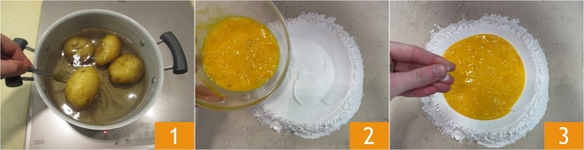 To make radicchio, potato and cheese fondue ravioli, start by boiling the potatoes with their skins for about 30 minutes, or until tender. Check doneness by piercing them with a fork. Meanwhile prepare the fresh pasta: pour the flour onto the work surface, form a well and pour the beaten eggs in the center 2, then add a pinch of salt 3.