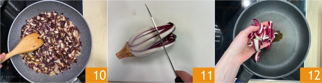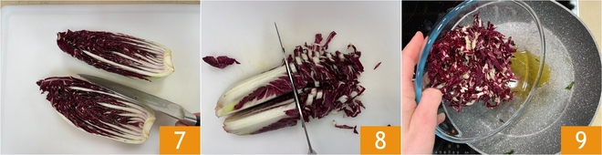 Now work on the long radicchio: cut it in half lengthwise 7 and slice it into thin strips 8. Heat a skillet with a drizzle of olive oil and add the radicchio 9.