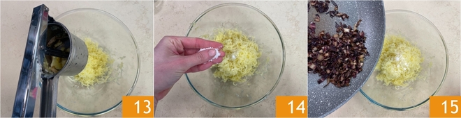 Take the boiled potatoes and press them through a potato ricer 13, collect the puree in a bowl, season with salt 14 and fold in the sautéed long radicchio 15.