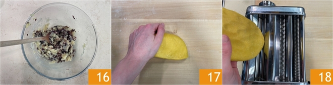 Mix to obtain a homogeneous mixture 16 and set aside. Now take the pasta dough, remove half of it 17 and keep the rest wrapped to prevent it from drying out. Flatten the dough and pass it through the rollers of a pasta machine 18.