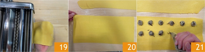 Work from the widest to the narrowest setting 19; you should obtain sheets about 0.04 in thick (about 1 mm) 20. Now transfer the filling into a piping bag and form small mounds spaced apart with about 0.35 oz of filling (about 10 g) 21.