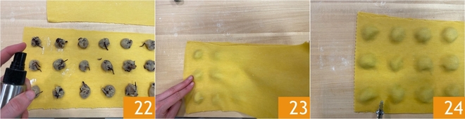 Sprinkle water on the edges 22 to help the pasta adhere, and cover with another sheet 23, overlapping. Seal the edges well by pushing out any air. Now cut the ravioli with a fluted pastry wheel 34.