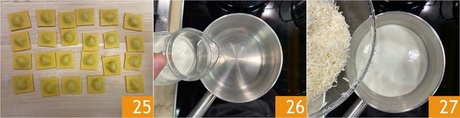 The ravioli are ready 25. Now prepare the fondue: heat the cream in a small saucepan 26, add the grated Fossa cheese 27 and let it melt over low heat.