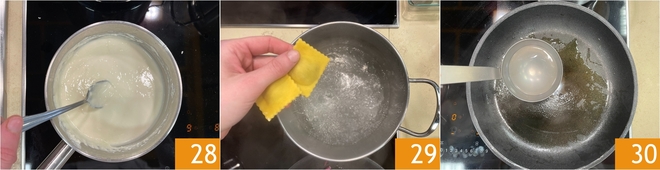 Keep the fondue warm 28 and cook the ravioli in boiling water for about 5 minutes 29. Meanwhile, pour a ladleful of the cooking water into the skillet 30.