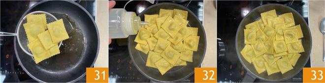 Drain the ravioli there 28, add a drizzle of oil 32 and toss them for a few more moments 33.