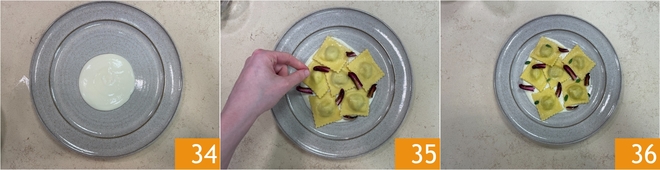 Plate by pouring the cheese fondue in the center 34, then add the ravioli and garnish with the sautéed late radicchio tips 35 and small fresh marjoram leaves. Serve the radicchio, potato and cheese fondue ravioli immediately 36.