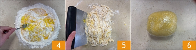 Incorporate the flour first with a fork 4, then use a bench scraper 5, and finally knead by hand until you obtain a homogeneous dough. Wrap it in plastic wrap and place it in the fridge 6.