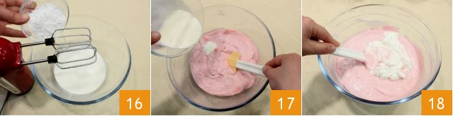 You can whip the remaining cream with the other half of the powdered sugar 16. Then combine the cream in which you dissolved the gelatin and the whipped cream with the mascarpone and raspberry cream. Mix the mixture thoroughly (17-18),