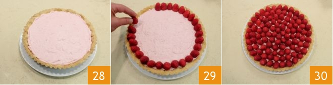 Level the cream 28 with the help of a spatula and decorate the surface with raspberries arranged in a radial pattern, from the edge to the center 29: your raspberry tart is ready to be enjoyed 30!