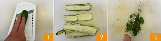 To prepare the raw marinated zucchini, first wash the zucchini, trim them, and dry them well. Slice them thinly lengthwise using a mandolin 1 2. Wash and chop the mint 3.