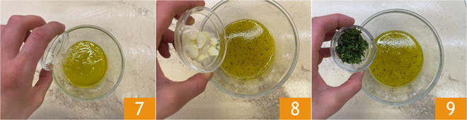Add the apple cider vinegar 7, the garlic cloves cut into pieces 8, and the chopped mint 9. Mix with a whisk to combine everything.