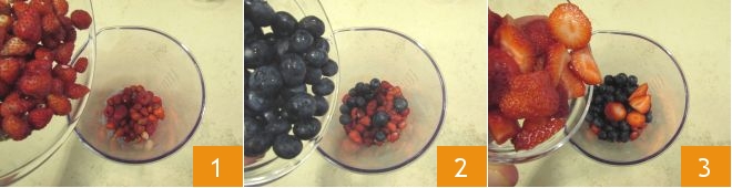 To prepare the red berry sorbet, place the raspberries, wild strawberries 1 in a bowl, then add the blueberries 2 and strawberries 3.