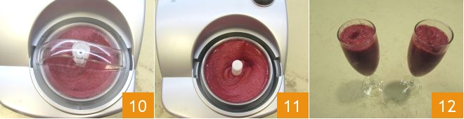 then turn it on for 30 minutes 10. If you don't have an ice cream maker, you can proceed as follows: pour the mixture into a wide bowl and place it in the freezer for at least an hour. Then take it out, stir it with a fork, and repeat the operation until you obtain the desired consistency every half hour or so. In this case, using the ice cream maker, once the 30 minutes have passed, stop it: you'll have obtained a mixture that's rather compact but also creamy! 11 Your red berry sorbet is ready to be served 12!