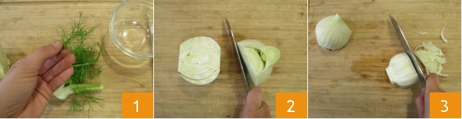 To prepare the red mullets en papillote, start by cutting and cleaning all the ingredients. Begin with the fennel. Cut off the fronds but set them aside 1. Then slice the fennel in half 2, remove the outermost part, and finally slice thinly 3.