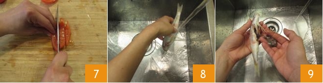 Finally, cut into strips and then into squares of about 0.4 inches 7. At this point you have everything you need, proceed to clean the red mullets. After rinsing them thoroughly under water 8, make an incision with scissors at the belly and empty them. Then rinse inside and outside again 9.