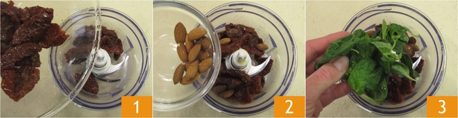To prepare the risotto with red pesto, start by making the pesto: place the sun-dried tomatoes in a mixer 1 along with the almonds 2 and basil 3.