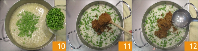 Halfway through cooking, add the peas 10 and continue adding boiling water as needed. Once cooked, turn off the heat and stir in the red pesto 11, thinning it if necessary with a little boiling water 12.