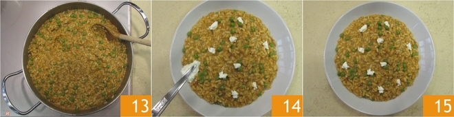 Mix well to combine 13 and plate, garnishing with dollops of robiola cheese 14, pepper to taste, and some fresh basil leaves: your risotto with red pesto is ready to be served 15!