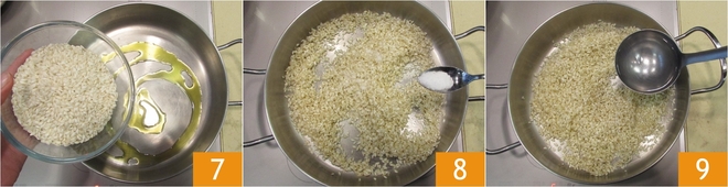 Bring a pot of water to a boil and start making the risotto: add the rice to a saucepan with a drizzle of hot oil 7 and toast it over high heat for a few minutes, then add the salt 8 and stir. Cook the rice by adding a ladle of boiling water at a time 9; it will take about 15 minutes.