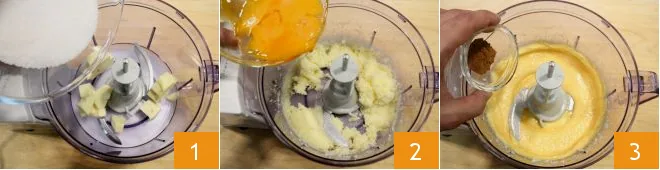 To prepare the red wine cake, cut the butter at room temperature into cubes and place it in a food processor with blades; add the sugar 1 and blend everything until you get a cream. Separate the yolks from the whites (keep the whites, as they will be used later) and gradually add the yolks to the mixture 2; mix them well, then add the ground cinnamon and cloves 3.