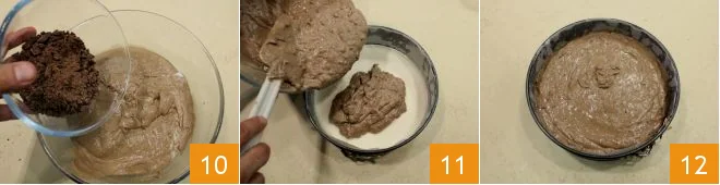 And add it to the batter you have prepared 10. Butter and line with parchment paper a 9-inch cake pan and pour the batter into it 11, leveling it well with the spatula 12.
