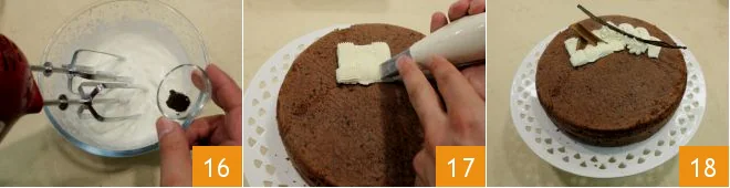 Add the vanilla seeds and continue mixing with the beaters 16. When the cream is ready, place the red wine cake, which should be cooled by now, on a serving plate or a cake stand; finally, using a piping bag with a star nozzle, decorate it with the whipped cream you have prepared 17 and serve 18. For a more refined final touch, you can also add a whole vanilla bean and a couple of cinnamon sticks to the decoration.