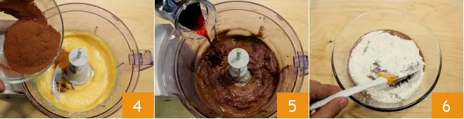 Also add the unsweetened cocoa powder 4 and then the red wine 5. Stir until you obtain a uniformly colored cream and at this point transfer the batter into a bowl; add the sifted flour mixed with baking powder and mix well with a spatula to avoid lumps 6.