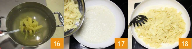 Cook them for the time indicated on the package and drain them while still al dente 16 into the pan where you previously poured the asparagus pesto 17, turn on the heat to medium and toss the pasta for a few seconds 18.