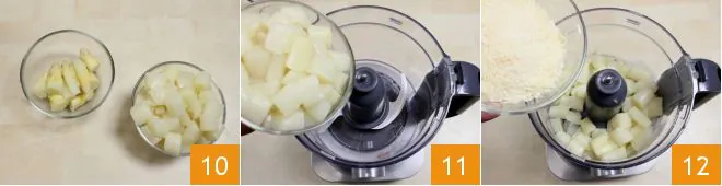 Now that you have the asparagus parts ready 10, place the chopped stalks in a mixer 11 and add the grated and mixed Pecorino and Parmesan 12.