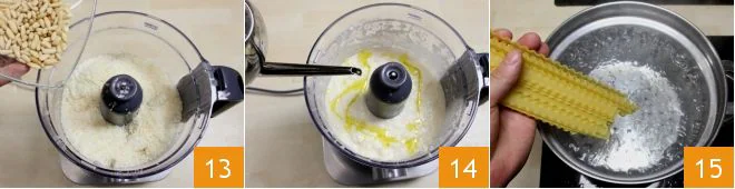 Add the pine nuts, pepper, and salt 13. Then blend everything to obtain a smooth cream, then stop the mixer and add the oil 14; let the blades run for a few more minutes to create a thick and smooth cream. Transfer the obtained cream to a large pan and set aside for the final creaming. Meanwhile, in a large pot, add water, salt to taste, and bring to a boil. Then pour in the reginette 15.