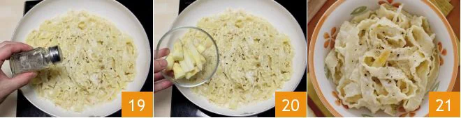 Adjust with pepper to taste 19, add the asparagus tips you set aside 20, and serve your delicious reginette with white asparagus pesto hot 21!