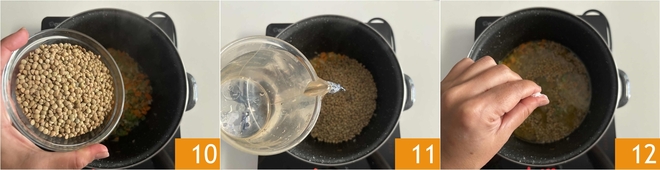 Next, add the lentils 10, pour in the water 11, and add the salt 12. The lentils do not need to be soaked but can be rinsed beforehand.