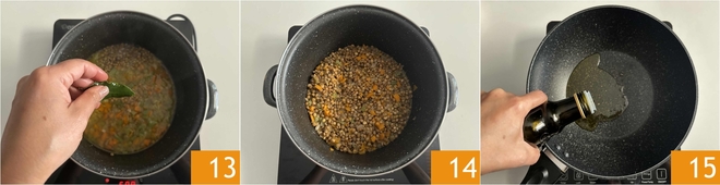 Add the bay leaf 13, mix everything well, and cook the lentils over low heat for about 30 minutes 14. Once the lentils are ready, you can start preparing the rice. Pour a drizzle of extra virgin olive oil into a pot and heat it 15.