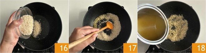 At this point, add the rice 16 and toast it for a few moments, stirring with a wooden spoon 17. Then moisten it with a ladle of vegetable broth 18.