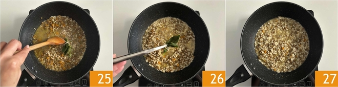 Continue cooking, always adding broth only when needed 25. Once cooking is complete, remove the aromatic herbs 26 and turn off the heat 27.