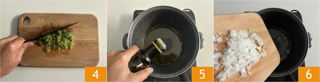 Next, prepare the celery, which should also be chopped with a knife 4. Pour a drizzle of extra virgin olive oil into a pot 5, add the onion 6.