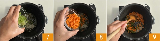 Then add the celery 7, the carrot 8, and sauté them for a few minutes over low heat 9.