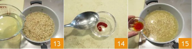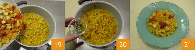 Cook the three grains by adding the broth little by little 13. Dissolve the saffron sachet in a small bowl with some broth 14. When it is completely dissolved and free of lumps, add it to the grains that are cooking 15. Salt and pepper. Continue cooking by adding broth gradually.