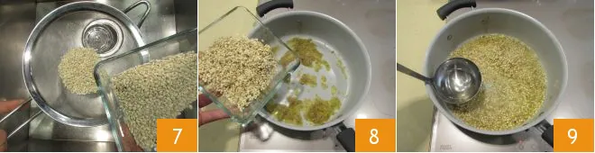 At this point, take the spelt and rinse it in plenty of water, using a sieve 10. Then, add it to the barley while it is cooking in the saucepan 11 and also add the rice 12.