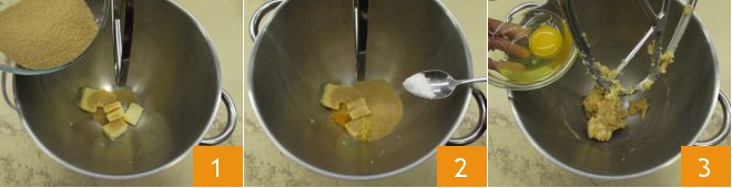 To make the rice cake, first take care of the pastry: in the bowl of a stand mixer fitted with a paddle, add the cold butter cut into pieces, the brown sugar 1, flavor with lemon and orange zest, then add a pinch of salt 2 and start the mixer. Add the egg 3 and turn on the machine.