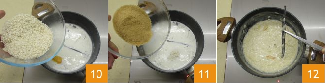 When the milk reaches a boil, pour in the rice 10 and the brown sugar 11. Cook for 30 minutes, towards the end of cooking remove the vanilla bean 12 and the citrus peels.