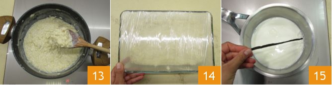 When the rice has absorbed the milk and is quite thick 13, turn off the heat, transfer to a baking dish, cover with plastic wrap 14, and let it cool for at least 2 hours. In the meantime, prepare the cream: heat the milk in a saucepan with the vanilla pod and its seeds 15.