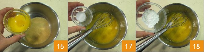 In another saucepan, add the brown sugar, egg yolks 16, a pinch of salt 17, and cornstarch 18, and mix with a whisk to combine the mixture.
