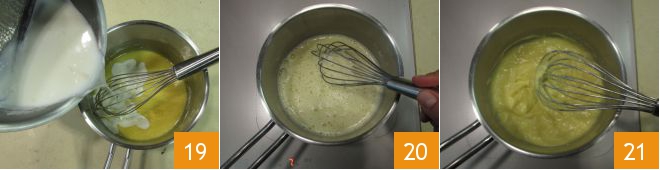 Gradually pour the hot milk, taking care to remove the pod, always mix with the whisk 19, return to the heat 20, and cook over moderate heat until the cream thickens 21.