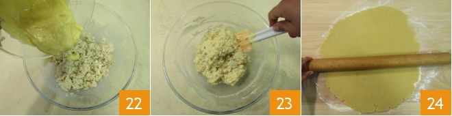 Combine the cream with the rice 22, mix 23, and set aside. Take the pastry and roll it out on a work surface with the rolling pin, it should be ¼ inch thick 34.