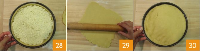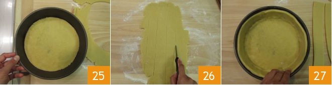 Take a cake pan that is 8 inches at the bottom and 9 inches at the edge, cut out a disc of dough by placing the mold over it to shape the form. Place the disc on the bottom of the cake pan 25. With the excess dough, cut strips about 1½ inches wide 26 and use them to line the edge 27.