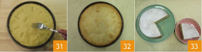 Prick the surface with the tines of a fork 31 and bake in a preheated static oven at 356°F for 60 minutes. Once cooked, take the rice cake out of the oven 32, let it cool, then remove from the mold and dust with powdered sugar 33.