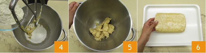 Once the egg is incorporated, add the two flours 4, continue kneading until you obtain a homogeneous mixture 5. Form a dough, wrap it with plastic wrap 6 and let it firm up in the fridge for 3 hours.